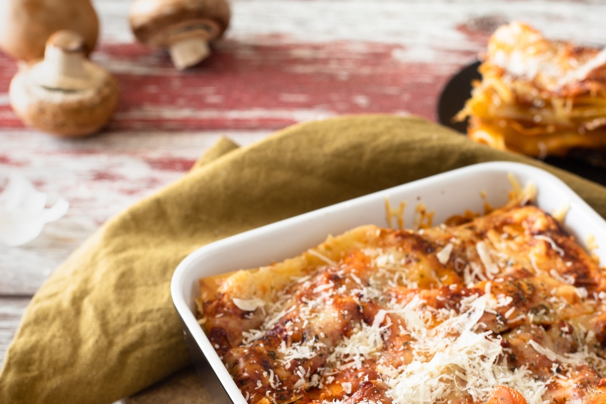 - Alterner les couches de champignons, de lasagne et de sauce béchamel. Répéter l'opération jusqu'à ce que la casserole soit pleine.